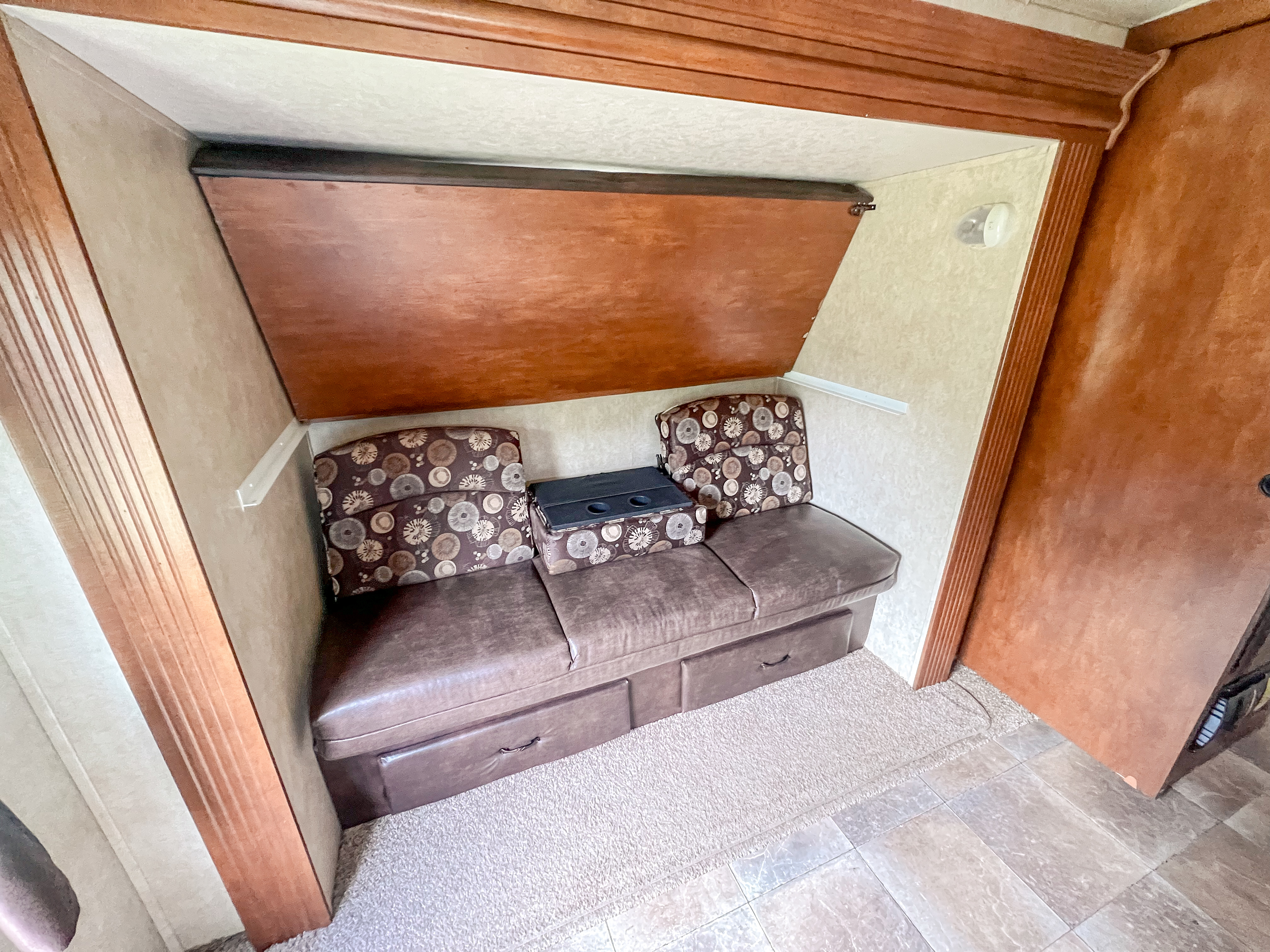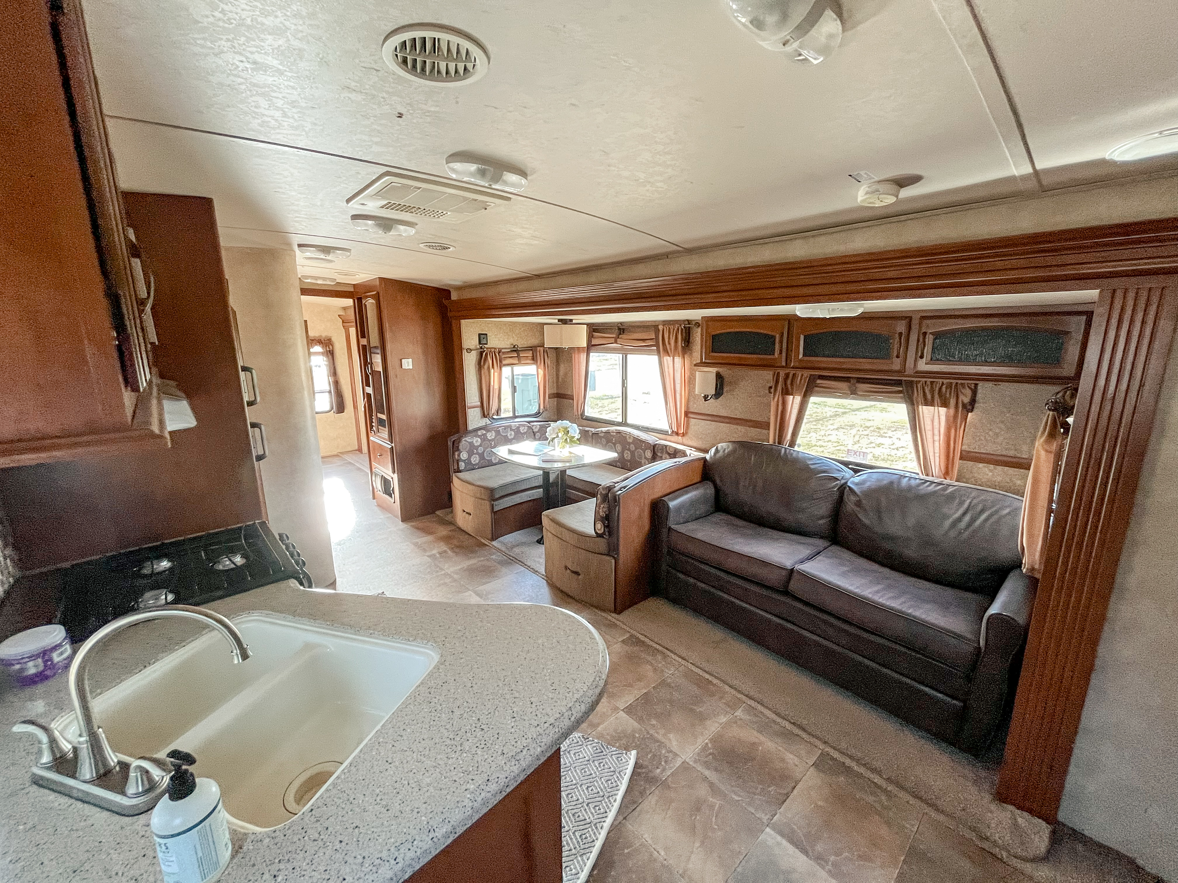 Inside, you’ll find a private bedroom with a cozy Queen size bed, perfect for a good night’s sleep. The rear boasts three bunks and there’s a sleeper sofa that magically transforms into a full size bed. Plus, the dinette can be set up as another full size bed. This camper comfortably sleeps up to 9 people, so bring the whole crew!