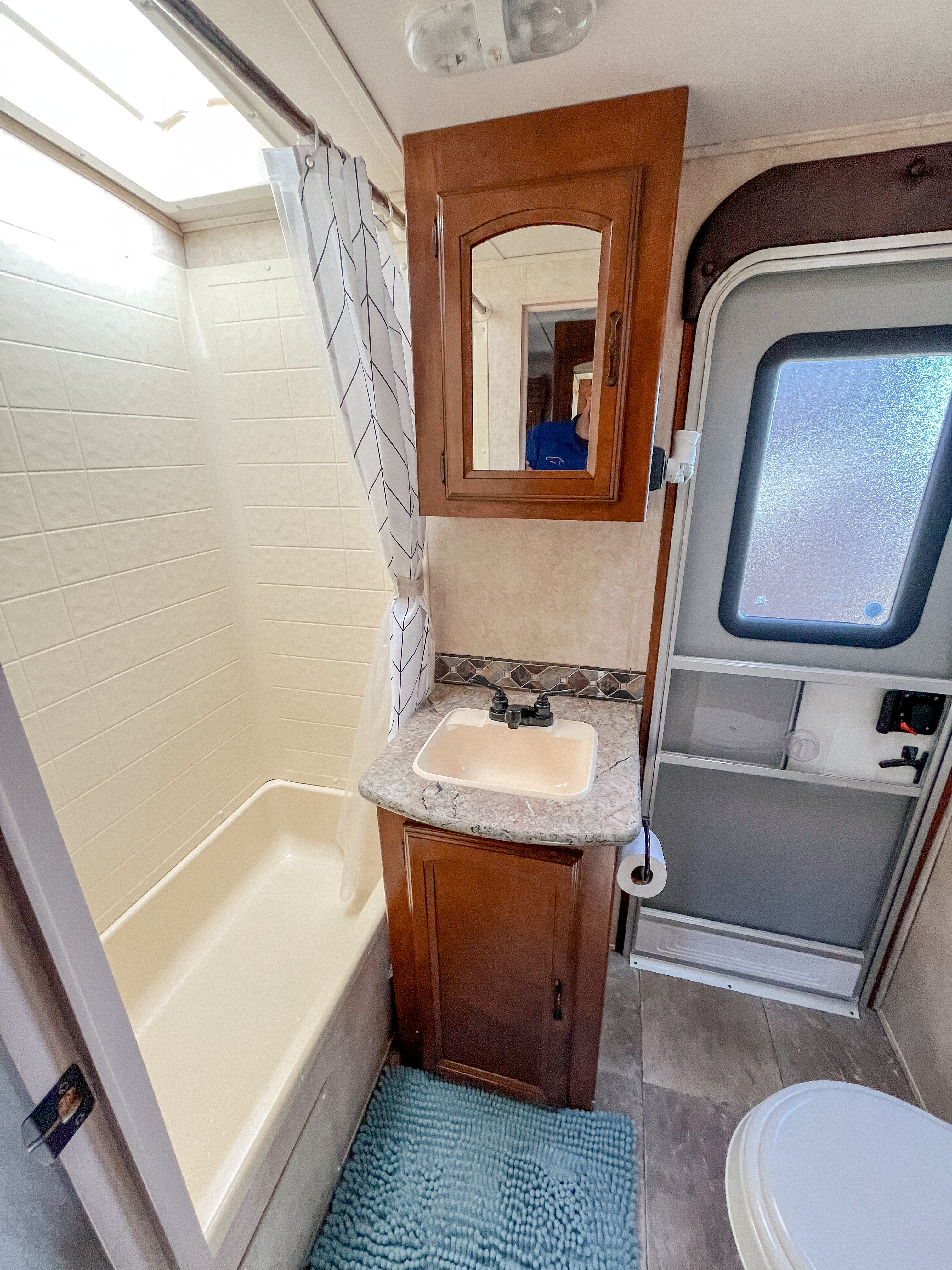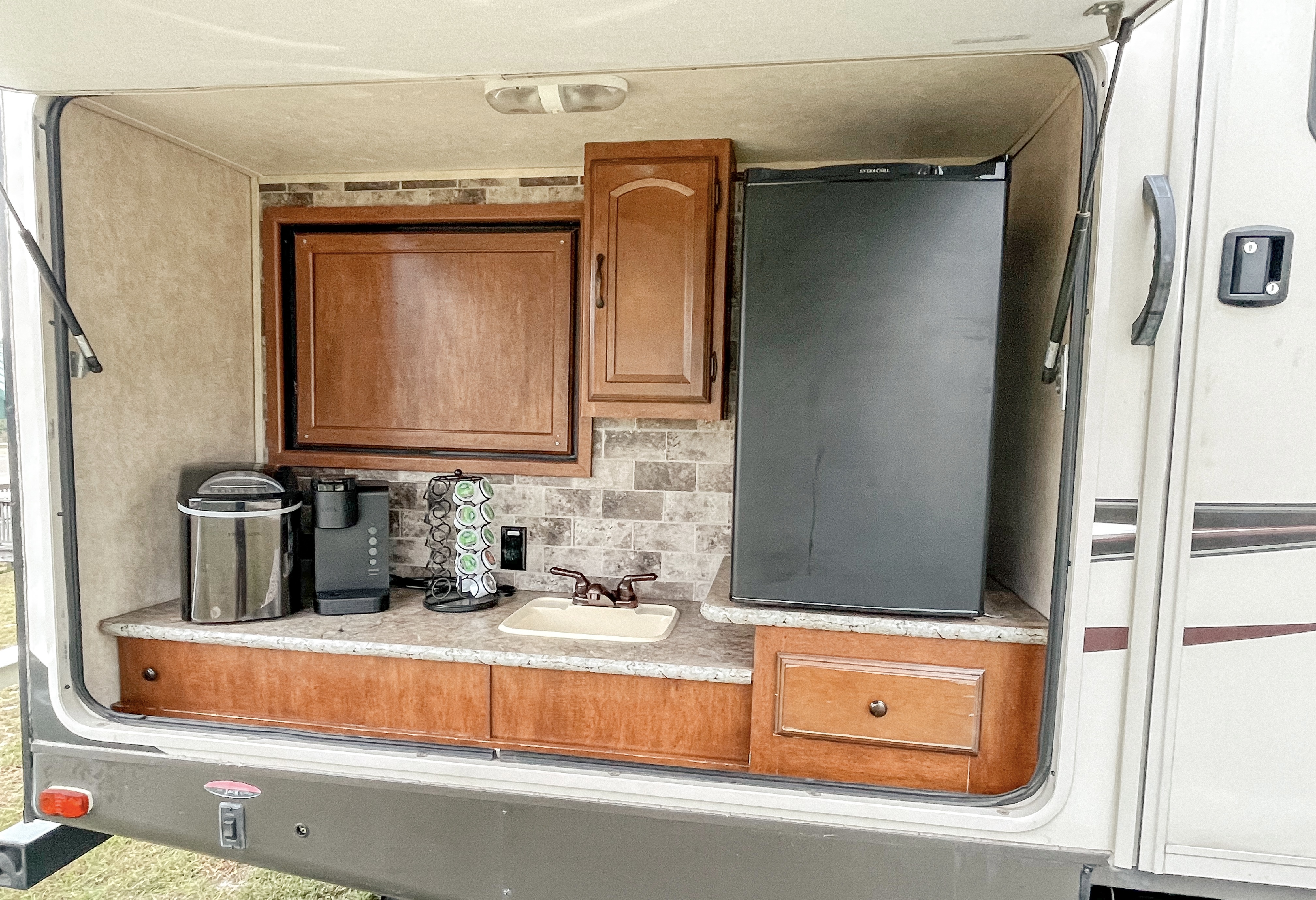 The bathroom is a haven of space, perfect for getting ready or enjoying a refreshing shower. And if you’ve been out playing in the sand or dirt, no worries! There’s even an outside shower at the back for rinsing off before stepping inside.